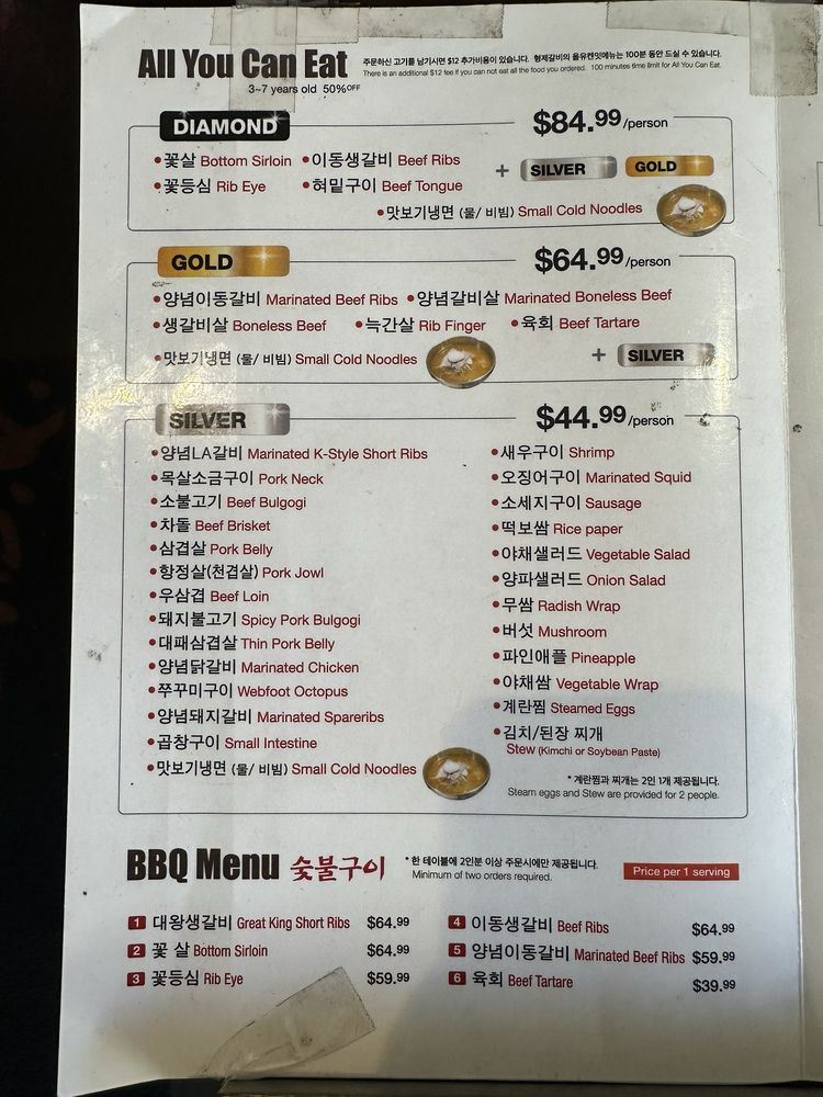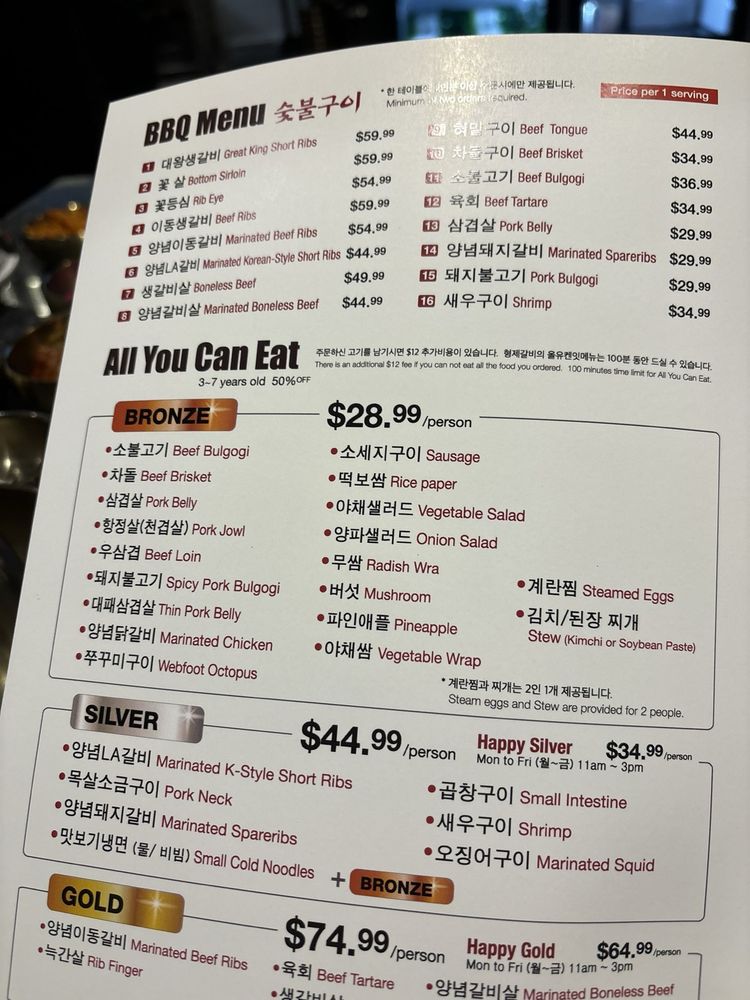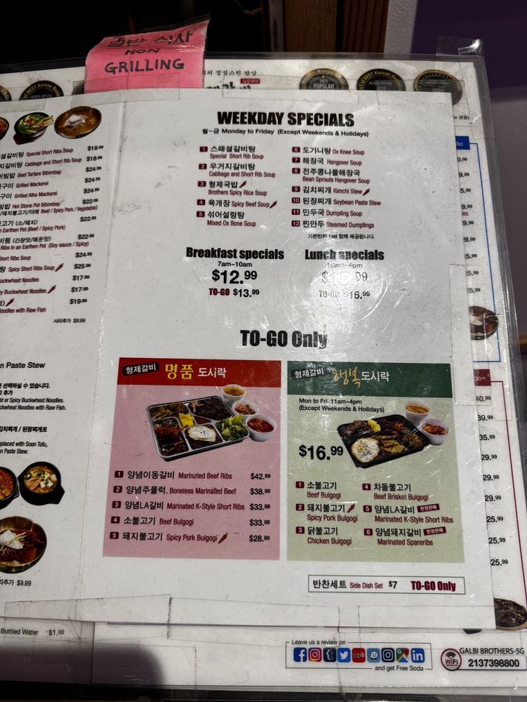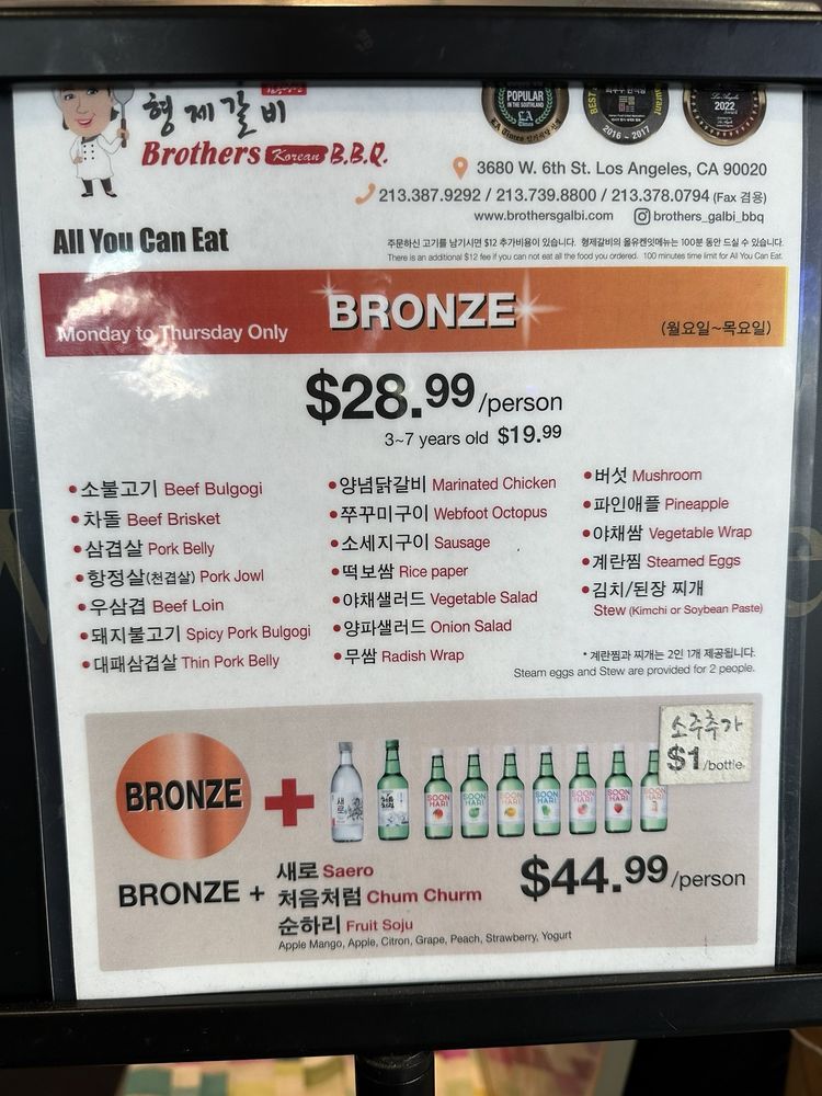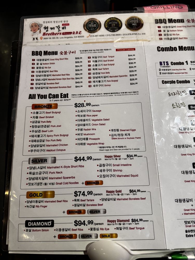 Introducing Brothers BBQ, a popular spot in Koreatown known for its quality cuts of meat and attention to detail in preparation. Offering a range of marinated beef, pork, and chicken options grilled right at your table, the flavors are rich and smoky. Highlights include the marinated bone-in short rib and the beef brisket BBQ combos with noodles. The AYCE menu at $45 per person offers a variety of meats, with banchan options and attentive service. The ambiance is luxurious with a designated button for calling your server, adding to the overall experience. Prices are reasonable, and the quality of the food continues to impress diners. Whether you're looking for a casual lunch or a group dinner, Brothers BBQ is a must-visit for Korean BBQ enthusiasts.